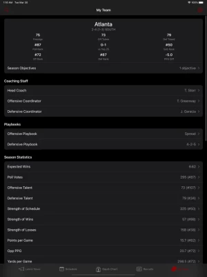 Your team will play 12 games in the regular season: nine against your conference opponents once and three out-of-conference games. The most important game of the regular season is your rivalry game: winning it will net you more program prestige points, while losing it will cost you some.