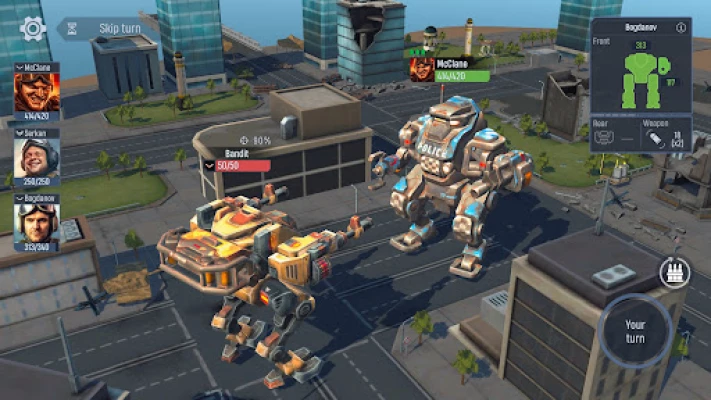 In offline and PvP modes, you'll face a variety of enemies and engage in intense battles where each turn counts. Your tactics will be crucial to achieving victory, so plan your attacks carefully and keep your enemies in your sights. Collect the most powerful mechs for every mission and equip them with the right weapons to test in real battles. The more you win, the more you can upgrade your combat arsenal!