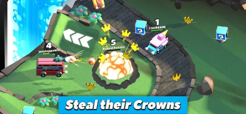 Welcome to Crash of Cars, a REAL-TIME MULTIPLAYER game where your goal is to collect as many crowns as possible before getting destroyed. Use power-ups and smash into opponents to destroy them; then swoop in and take any crowns that they drop. Be careful though, the more crowns you collect, the bigger your bounty becomes – making you a bigger target for other players to destroy!