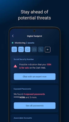 Real-time monitoring for identity theft, data breaches, dark web exposure, and credit changes, plus recovery support.