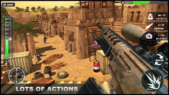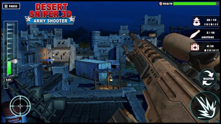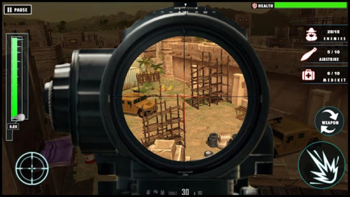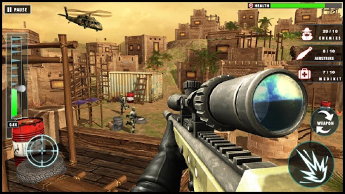 Army war sniper 3d, hit all targets and complete all the assassin missions. Counterattack the mafia terrorist enemies with modern sniper rifles. The key to professional sniper shooting accuracy is to choose best shooter warfare weapons. Desert sniper 3d is about free guns and fps games where real shooting skills are needed. This free to play offline war sniper mission games has best war arsenal for rapid firing. Firing a shot at the target is not child's play. Enjoy this best shooting action with realistic 3d graphics and fps shooter controls. Shoot fire at multiple targets in the real battlefield conditions. These are the time of modern war games! Lock your target and load your guns to experience the free action of war sniper games.