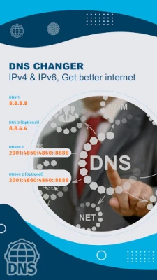 DNS Changer - IPv4 & IPv6, Optimize Internet Speed app changed DNS server easily and simply. DNS Changer is working without root and you can use it for both WiFi and Mobile Network Data Connection (3G/4G).