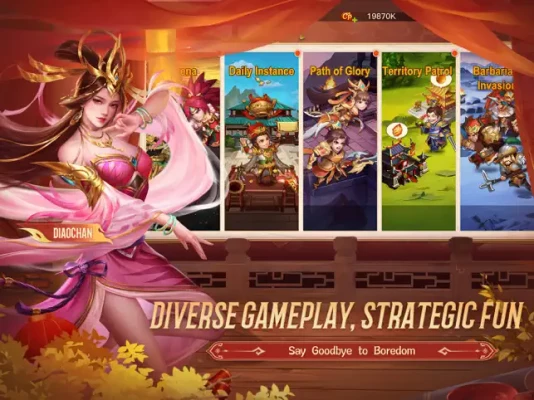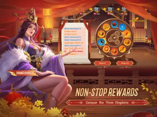 Enjoy daily login bonuses and endless rewards to help you conquer the Three Kingdoms.