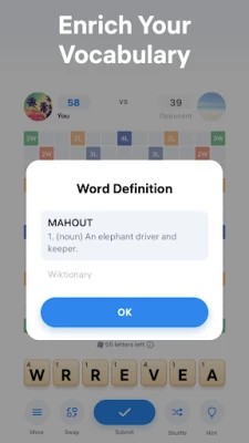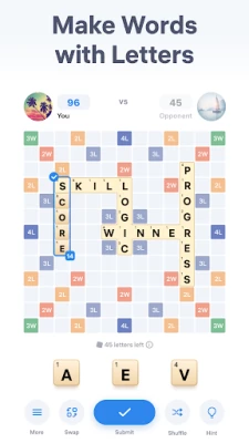In this word puzzle game, players take turns to compose words with the letters from their deck. Each letter has its own points. The main goal is to reach the highest score by making words on the board with your letters. Unscramble words and sharpen your mind, anytime and anywhere.