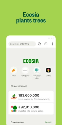 Ad blocker and fast browsing — The Ecosia app is based on Chromium and gives you an intuitive, fast and secure browsing experience with everything you need, including tabs, incognito mode, bookmarks, downloads and a built-in ad blocker. We also show a green leaf beside your results that are pro-environment, helping you make greener choices whilst you search.