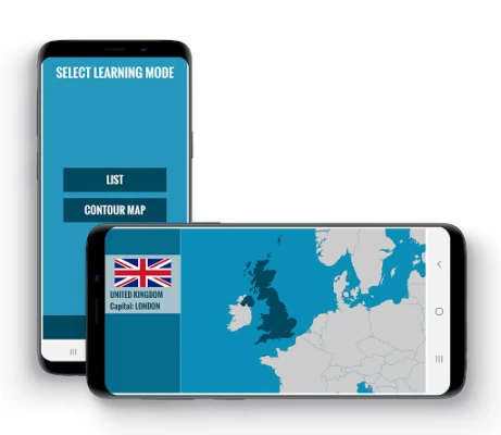 The application contains a contour map of the world: after selecting a country, its borders will remain visible; its flag, name and capital will be displayed on the side of the screen.