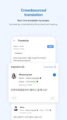 Crowdsourced translation service is available only from Flitto! This 'human translation' service, powered by over 10 million users in 173 countries all over the world, will give you translation results in just 3 minutes on average.