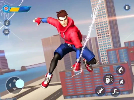 The game happens in a big city with lots of tall buildings. You can use your web to move fast and fly over the city. This makes the game very exciting. You can see everything from up high as you fly around.