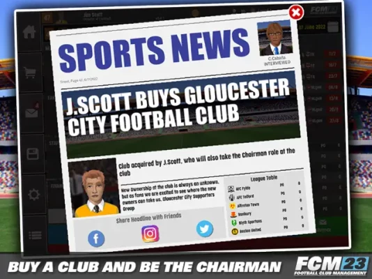 Improve your reputation and move to bigger and better jobs as you earn reputation and build coins to one day being able to mount a takeover and own your very own club and become the chairman!