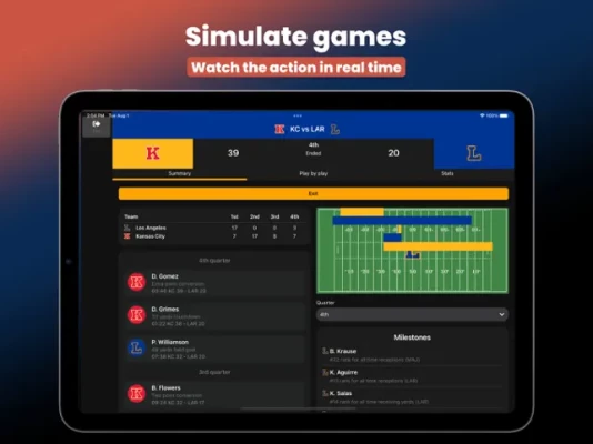 Live Play Map: Experience the action like never before! When simulating a game, you can now view the position of plays on a 2D field.