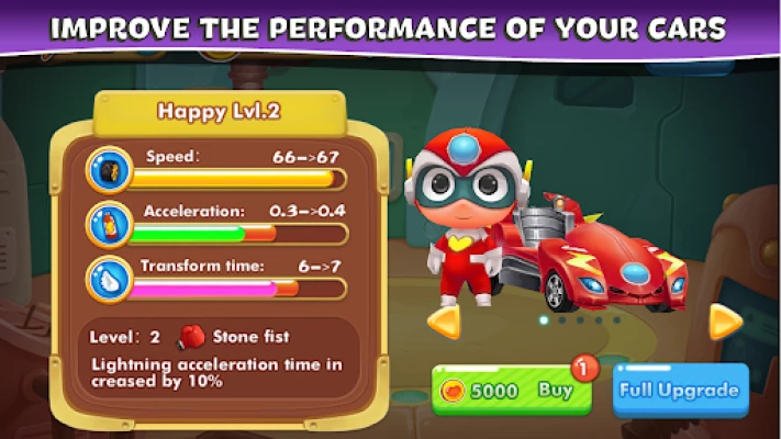 Use the coins to upgrade your cars with new power-ups, this will make your powers last longer or have a more powerful effect.