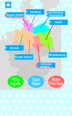 Some place-names are different between English and German. (For example, "Bavaria" in English is "Bayern" in German.) If you want to learn place-names in German language, select "German" in setting screen of this app.