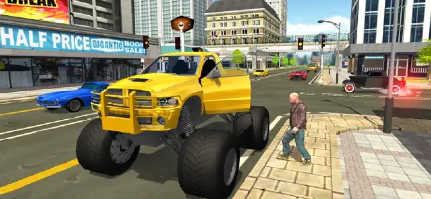 - Easy control - Fantastic graphics - Specific cars - Monster truck - Motorcycle riding - Quadrocycle riding - Motorboat riding - Buying a car - Auto salon - Wild island - Animals - Predators - Control of the third person - Grand Street - Grand City - Beautiful town - Fantastic car physics - Fantastic people physics - Football field