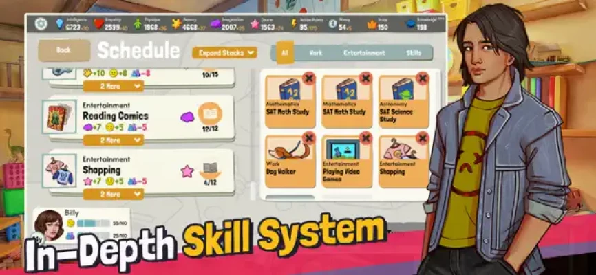 Growing Up features a variety of systems. Build your mind and aptitude with our handcrafted mini-game; Master the art of scheduling your daily activities; Ace your way into the best school in challenging exams; Build your character by participating in a plethora of extracurricular activities.