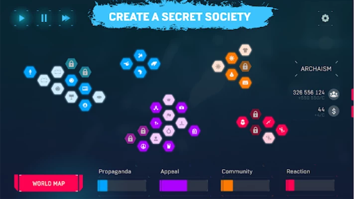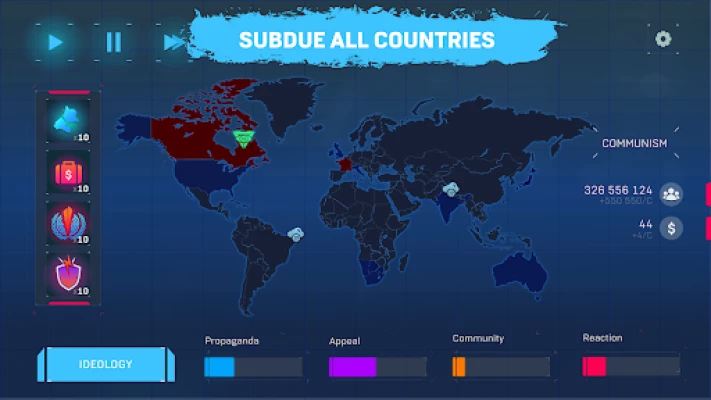 The game features 8 fictional political ideologies: Communism, Capitalism, Imperialism, Anarchy, Libertarianism, Ecologism, Militarism, Pacifism. Each ideology has unique upgrades, game mechanics, and expansion features.