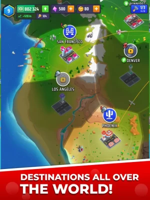 In Idle Airplane Tycoon, develop your airline by unlocking airports from all around the world: open flights to the most exotic destinations!