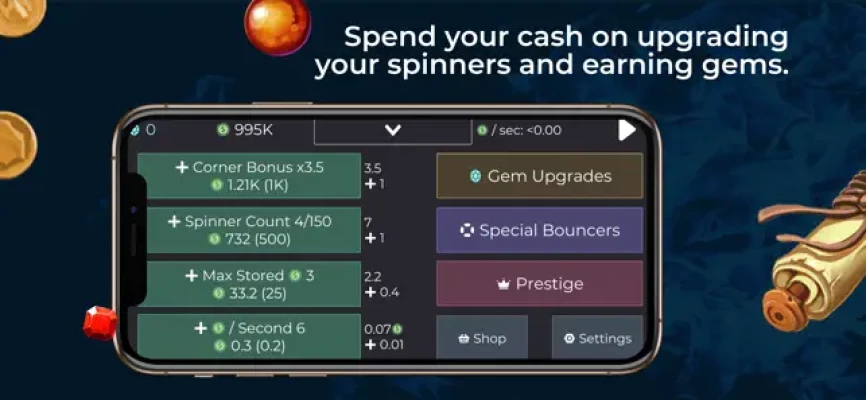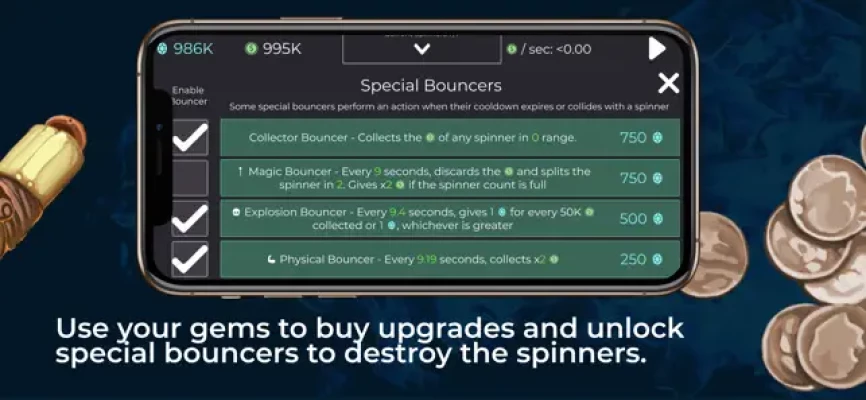 Use your gems to buy upgrades and unlock special bouncers to destroy the spinners.