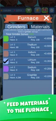 Spend the materials you grind up in the furnace to unlock the power of your grinders. Upgrade your grinders from the softest material all the way to diamond. You'll start weak but grow powerful in this incremental game!