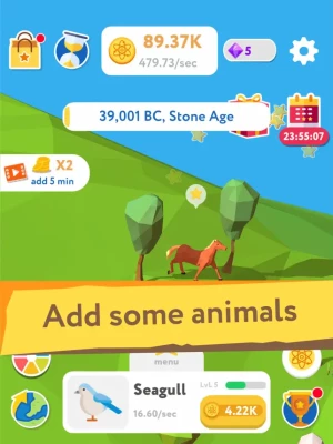 Start by creating a piece of land in the ocean, add plants, trees, stones, expand your territory, and add living species. Not only ancient inhabitants but also such animals as fish, elephants, horses, deer, birds, and even tigers will be available to you in the Evolution Idle Tycoon. Go to new eras to discover new constructions and new living creatures!