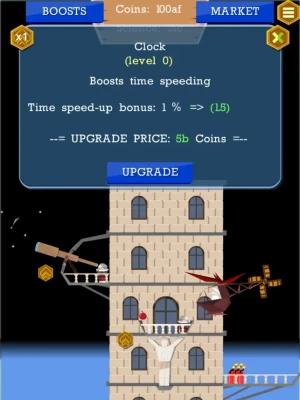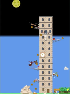 As the tower is growing, the more and more advanced technologies become available. For example, you can build the Clock, which speeds up the time. Or a helicopter, which dramatically increased stone production.