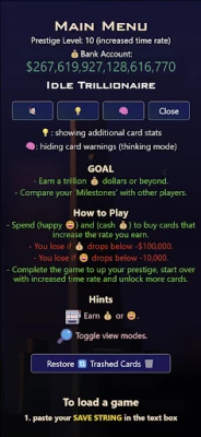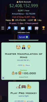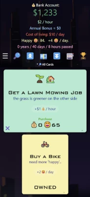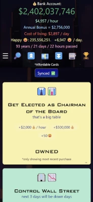 🌟 **Build Your Empire:** Begin your ascent to unimaginable wealth by strategically acquiring and upgrading resource-boosting cards. With each card purchase, watch as your earnings of both money and happiness skyrocket, setting the stage for an exponential cascade of riches.