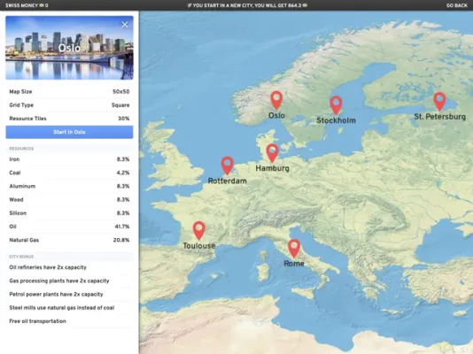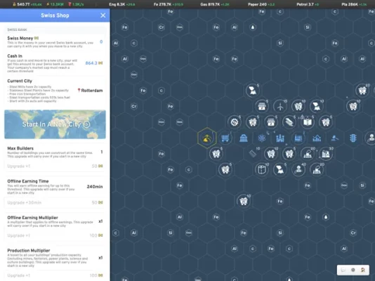 Prestige allows you to unlock new maps with new resources and endless possibilities. You also earn Swiss money to unlock permanent upgrades to help with start faster and expand bigger.
