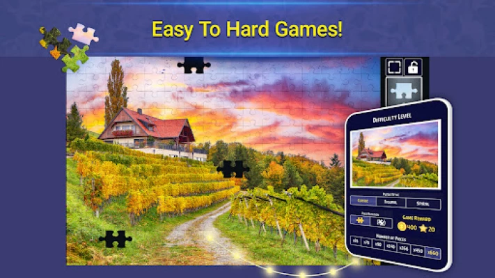 - Adjustable style and difficulty. Challenge yourself with harder puzzles and get bigger rewards. Be a Jigsaw puzzle Master!
