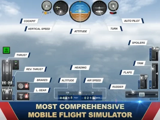 The Game also features Day/Night cycles, Dynamic Weather, Free fly mode, and a Cockpit view. Unlike most flight simulation games on mobile, Jumbo Jet Flight Simulator offers a comprehensive list of control systems, instruments and warning systems.