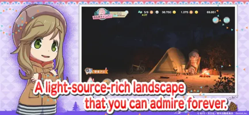 Familiar characters like Nadeshiko Kagamihara, Rin Shima, Chiaki Ōgaki, Aoi Inuyama, and Ena Saitō engage in dynamic and fully-voiced dialogues. Moreover, the game is packed with over 1,000 types of camping gear and vehicles, mouth-watering camp meals, and beautiful sceneries from locations centered around Yamanashi, Nagano, and Shizuoka, bringing you the world of "Laid-Back Camp".