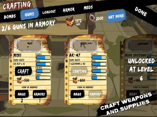 Craft guns, bombs, meds and armor Upgrade your guns with 50+ possible combinations Chose an ability that matches your play style Level up to unlock more crafting recipes