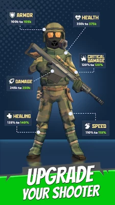 In this zombie shooting game, you can transform your last survivor into an invincible monster killer with a wide range of upgrades. The hero's upgrades directly affect how fast he can run and how accurately he can gun down zombies. Don't forget to upgrade the hero’s equipment and guns, which are crucial in our apocalyptic shooter game. A huge arsenal of auto-guns for every taste and power will be available to you. Upgrading and combining roguelite skills will grant the last survivor unlimited power, enabling him to mow down waves of zombies by the hundreds.