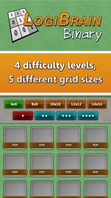 LogiBrain Binary includes 2000+ puzzles in different sizes and different levels of difficulty; easy (1 star), medium (2 stars), hard (3 stars), very hard (4 stars);