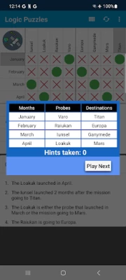Enjoy Logic Puzzles with 100 unique brain puzzles of increasing difficulty and multiple sizes with no ads. These logic puzzles will keep your brain active and improve your cognitive skills. Smart Hints will teach your brain how to play and help your brain learn new patterns. Use the clues to fill in the grid and solve each logic puzzle. Work your way up from from a logic puzzle beginner to master! Use unlimited Smart Hints to see exactly which clue applies to the current board and why. Start with small 3×4 logic puzzles or challenge your brain with huge 4×7 cell puzzles.