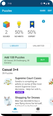 For more puzzles, you can purchase extra volumes each with 100 new puzzles of the same sizes as in the initial app. Alternatively, the optional monthly subscription unlocks 10,000 puzzles of all sizes. It will automatically renew unless you cancel at least 24 hours before the end of the monthly period. You can manage or cancel your subscription anytime in your Google Play account settings or using the Manage button in the app.
