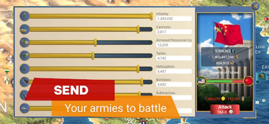 πͺ Build an invincible army: tanks, fighters, helicopters, warships, submarines; study and build nuclear weapons and warheads.