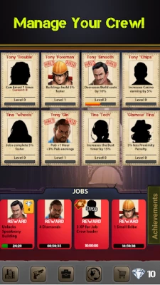Level up and upgrade your Crew to run jobs for you that give you Cash bonuses or special Powers! Manage your Crew and choose your reward careful!