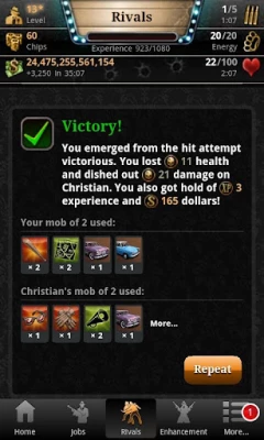 In Mafia Game you get to experience exciting adventure in the swinging 50s, as you climb the ladder rising from small time crook to Mafia boss. Collect experience and train your fighting skills in this role playing game in order to take out your unscrupulous rivals. You can form your own mob with friends to become stronger and to climb the high score lists.