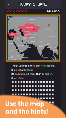 - Today's Game: Each day, there's a new country to guess for everyone around the world. Use the hints and move around the map to figure out the correct answer!