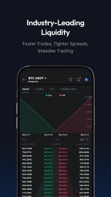 In futures and spot markets, the tradable volume at mid-price ±0.05% (5 bps) is significantly ahead of competitors. This results in smaller spreads, more stable trading, and faster execution.