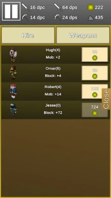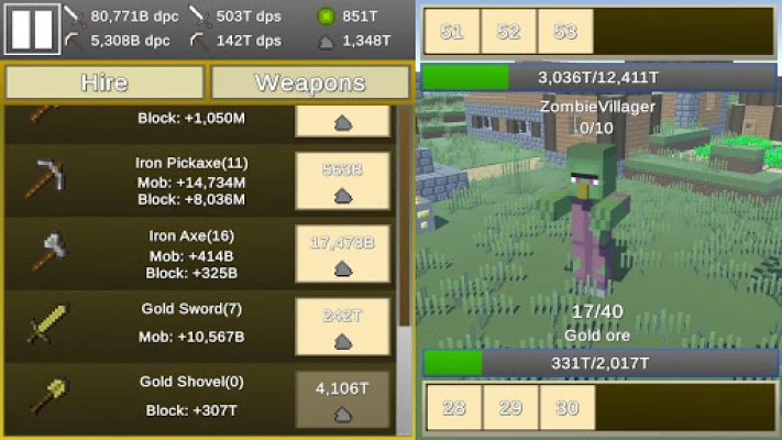 Tap to kill mobs and blocks. Earn xp and blocks to buy tools upgrades and hire new friends.
