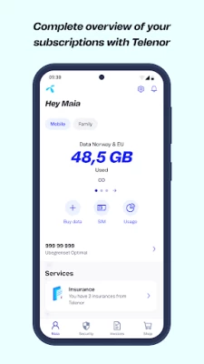 Mitt Telenor gives you a full overview of all your subscriptions and services in Telenor! Stay in control of usage and costs, view your invoice or add extra data to your subscription - available both in Norway and abroad.