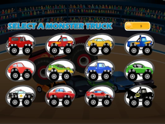 There is 12 Monster Trucks to choose from including the bat monster truck, earn coins in game to get new trucks by running over cars. and 10 levels of jumping hill climb fun in this kids and toddlers racing game.
