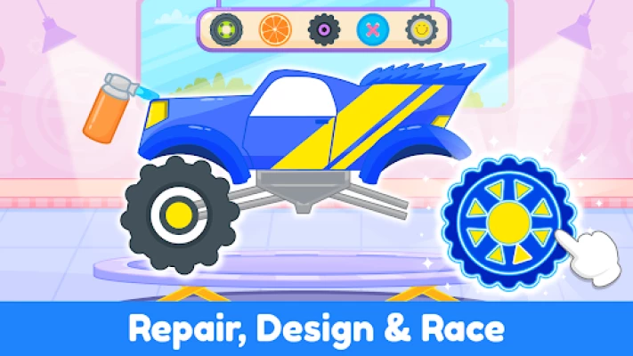 🎨 Color & Decorate: Let your child’s creativity shine! Paint the car, monster trucks and customize them with vibrant colors and fun decorations. Kids car games for toddlers with Garage