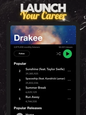 Grow your monthly listeners, create concept music videos or release official lyric videos. Gain followers, listeners, subscribers and earn royalties on streams, music video views and become the most popular artist in the world!