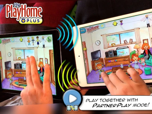 Now two people can connect their devices and play together in the same world! You just need to be connected to the same home WiFi and the PartnerPlay button should appear on the title screen when it detects another device playing My PlayHome Plus.