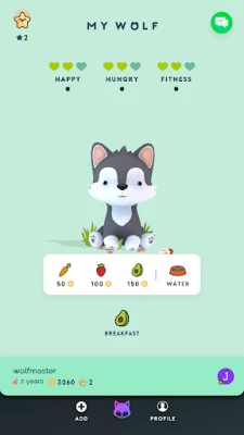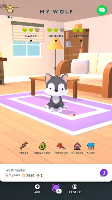 + Feed your pet wolf + Give your wolf lots of exercise + Customize your wolf with collars and hats + Play mini-games + Decorate your room + Put your wolf to sleep at night + Invite friends and co-parent your wolf together + Own multiple wolves.