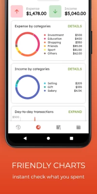 - Easy to read reports of the total expense, total income, spending by each category, or pending bills help you understand the cash flow better