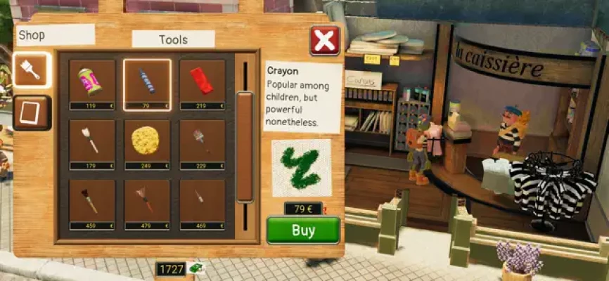 Use your hard-earned cash to treat yourself in the art supplies store. Maybe one of the many new tools will tickle your fancy? The crayons they just got in stock look pretty sweet! Or perhaps that heart-shaped canvas? You as an artist need every edge you can get to stand out! The residents of Phénix may also carry cool items they could give you, if you help them out of course. Become a true artist