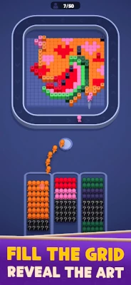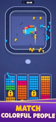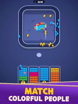 A looping conveyor belt moves your characters around a pixel art canvas, where each person searches for their matching tile. Tap the people in the lower columns to send them onto the belt and watch them jump onto the correct spot to paint it. Only a small portion of the canvas is paintable at the start, but every painted tile unlocks its adjacent ones. Time your taps, manage your people, and open new paintable zones one move at a time. Discover the uniquely calming yet strategic experience of building an image pixel by pixel with Pixel People.