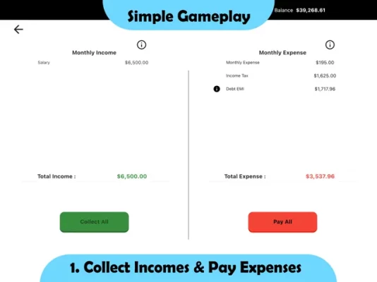 Pay expenses, Collect Incomes, Pay off loans, manage cashflow, Buy Stocks, invest in share market, real estate, mutual funds, fixed deposits and recurring deposits and get to know how to play the money game in real life.